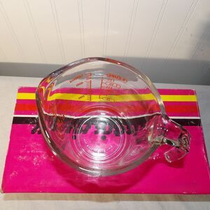 This vintage Anchor Hocking oven basics glass measuring cup is a must-have for any kitchen. It has a classic round shape and measures 4 cups, or 32 ounces, of liquid. The cup features red lettering and an open handle for easy use and pouring. Made in the United States during the 1960s, this measuring cup is a beautiful addition to any kitchen décor. It is microwave and dishwasher safe, making it convenient for everyday use. This cup is perfect for measuring ingredients for all occasions and is nummered with clear glass for easy reading. Add this traditional piece to your collection of kitchen tools and gadgets today. Pre-owned J-29