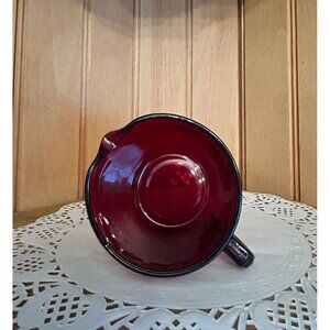 This ruby red glass creamer pitcher combines functionality and timeless style, ideal for serving cream or syrup. Its elegant design enhances table settings.