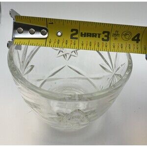 This vintage Anchor Hocking candy dish is a beautiful addition to any collection. The round, clear glass dish is adorned with a stunning star of David pattern and a decorative edge. Measuring 3.5 inches in diameter, 2.75 inches in depth, and 5.5 inches in height, this unmarked dish is perfect for storing trinkets or serving candy.