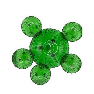 Step into a bygone era with this vibrant green glass bowl and matching 5 small bowls set. With scalloped edges and intricate patterns, it evokes timeless charm, perfect for sophisticated gatherings or nostalgic keepsakes. Its luminous green hue catches light beautifully, setting a mood of elegance and vintage allure.