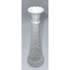 Vase is in good condition no chips or cracks. The Vintage Anchor Hocking White Milk Glass Stars & Bars Bud Vase has a classic design with a scallop top, measuring 9 inches in height. Made in the United States, this decorative piece features a traditional style with a glossy textured finish. The vase is adorned with a Stars and Bars pattern, decorative raised relief, and is opaque in nature. Perfect for any room in your home, this bud vase is a charming addition to your home decor. Crafted from white milk glass, this vintage item is easy to care for and adds a touch of elegance to your space.
