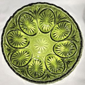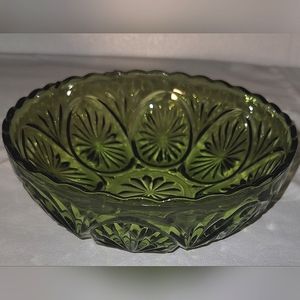 Vintage Anchor Hocking green serving bowl with star cameo medallion pattern. Bowl is 8 inches in diameter and 2 3/4 inches deep. Reduced price for chip on rim; see close-up pics.