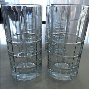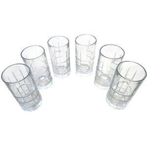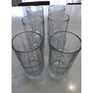 Beautiful vintage Anchor Hocking 6-piece glass set plaid geo pattern elegant and sophisticated yet casual glassware for drinking in good pre-owned condition minor signs of wear no major flaws. Sturdy. See photos for more description