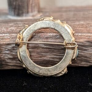 Vintage Ancient Egyptian Revival Carved Resin Scarab Wreath Circle Brooch. Pre-owned, this brooch is in excellent condition. Gold Tone.
