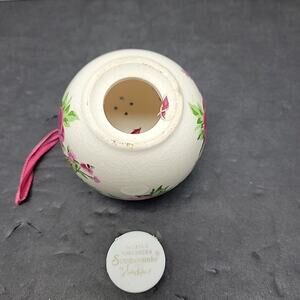 This vintage Andre Richard Sentomander Pomander ornament is a beautiful addition to any collection. Crafted from porcelain with a white base and pink floral accents, this ceramic piece is a unique and original work of art from Japan. The ornate design features pink flowers and a floral style.