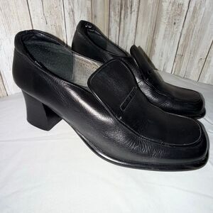 Vintage Andrea Black Leather Square Toe Loafer Pumps | 90s Y2K Block Heel Slip O