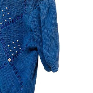 This vintage Andrea Gayle sweater is a delightful piece featuring a beaded argyle pattern on a soft, blue knit. Its short sleeves and unique design add a touch of retro charm.