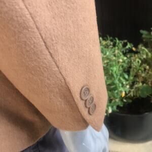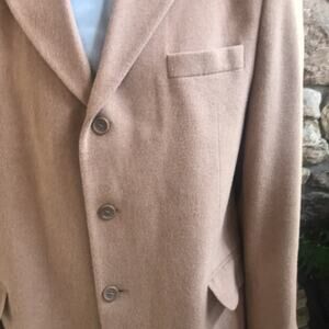 Vintage Andres Romanelli 100% Camel Hair Tan Sport Jacket Men's Size 44R. Has a small scuff to the fabric on one sleeve - shown. Measurements: chest:22, length:31. Shoulder: 19.5, sleeve: 25