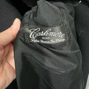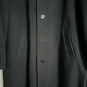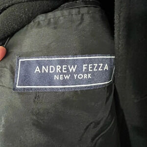 Vintage Andrew Fezza New York Overcoat Cashmere Wool Blend Size R44 Black XL/XXL. Deep front pockets. Holiday Event. See measurements. Shoulder to hem 41 inches. Wrist to shoulder seam 23 inches. Armpit to armpit laying flat 26.5 inches. This is missing one button (4th one down). If I find a button to match I will sew this on! Otherwise EUC.