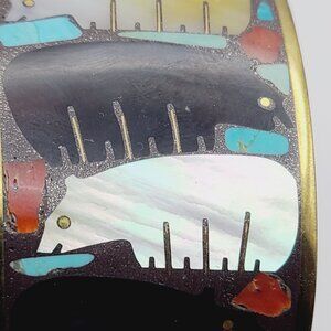 This bracelet features an intricate inlaid turquoise bear thick bronze cuff bracelet. White and black bears running from one end to the other with inlays of mother of pearl, turquoise, and coral. Rare as this motif is not listed anywhere, and signed by artist, Andrew Shows.
