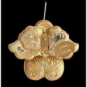 This stunning vintage brooch by Jane Davis features a beautiful angel design. The brooch is made of high-quality metal material and has an antique gold-tone finish. It is adorned with a faux pearl and rhinestone and is signed by Jane Davis, which guarantees its authenticity.