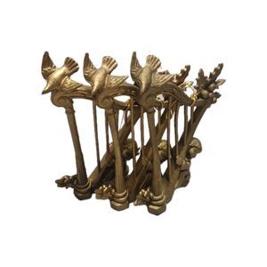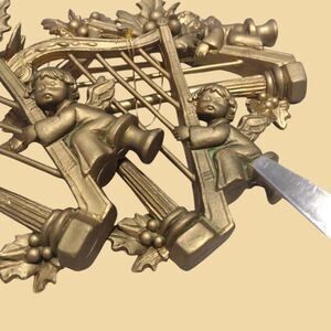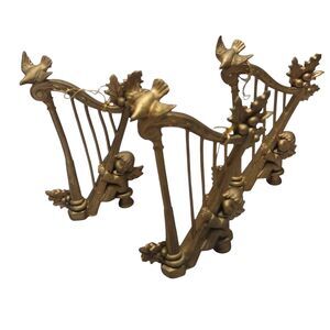 Vintage Lot of 3 Angel Cherubs playing harps in Gold, plastic 5.5 inch Christmas Ornaments and/or freestanding figures. Stamped ITALY with the original string hangers which might need to be changed since they are older. Great details with doves and holly leaves. There are a few minor spots of "greening" in the creases (see pics).