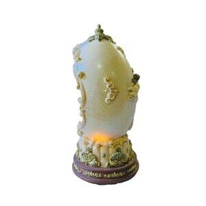 This beautiful vintage polyresin angel figurine from 1999 is a must-have for any collector of angel decor. With delicate gold edging and intricate details, this piece is sure to add a touch of elegance to any display. The angel figurine lights up and is artistically designed with embellishments that make it unique and eye-catching.