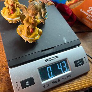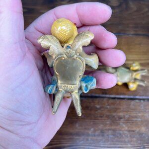 These charming vintage angel figurines depict musicians with delicate gold wings. Their intricate details and vibrant colors add a whimsical touch.