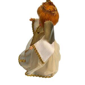 This vintage angel tree topper, crafted in 1960, features exquisite gold and white detailing. Distributed by Montgomery Ward, it stands at 6.5 inches tall. A charming addition to holiday decor, it showcases a unique vintage appeal. Its craftsmanship from Japan ensures quality and timeless elegance.