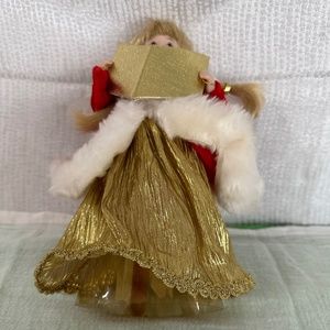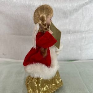Vintage Angel, Tree Topper, adorable blonde Angel w braids, red velvet with-faux fur shawl over a gold dress. Holding a song book. 9”tall