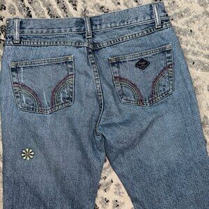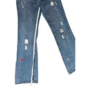 Patch, patchwork, star, butterfly, heart, distressed, holes in the knees, bootcut, mid rise, petite, short, stretch, stretchy, comfy, 90s, 2000s, hippy, peace, rainbow, pride
