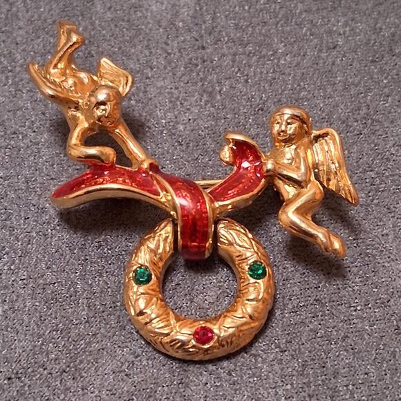 Vintage Angels Hanging Christmas Wreaths Brooch Pin