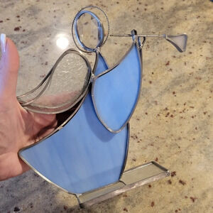 Stained glass stands 7.5" tall and is approx 9" wide from trumpet to wing tip.