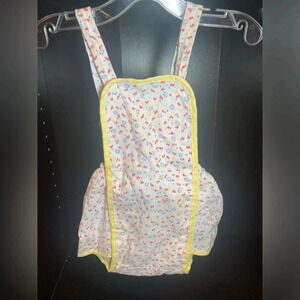 Vintage Animal Crackers romper with built in plastic bottoms. No rips, stains or bad smells. Size 24 months. Machine wash warm. Made in the U.S.A. There are four snaps on the front for easy dressing. Yellow lining with blue flowers and red lines as design. Ties around the neck. Open to offers. Smoke free home. SKU144
