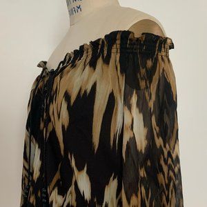 Vintage Animal Print Chiffon Blouse. Pull on woven top with elastic neckline that can be worn on or off shoulder. Long sleeve with elastic at wristband. Button and lacing details at center front.