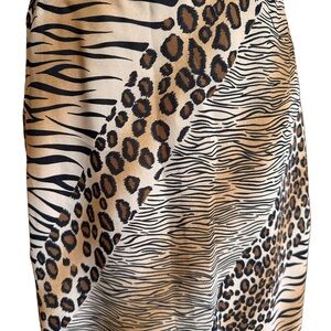 A retro animal print skirt by Express. This Y2K skirt has Colorblock animal print front and back and is fully lined in a soft satiny type of material. The waist is elasticized and the skirt lands just about the knee. This skirt is slinky and soft and just flows with your body.