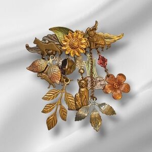 Charming brooch with animal and floral designs. Features cats, leaves, and flowers. Perfect for adding a whimsical touch.