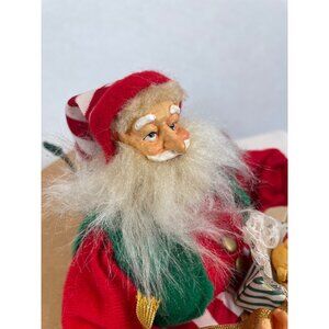 This whimsical Santa shelf/tree sitter, crafted with delightful attention to detail, brings a nostalgic charm intertwined with festive magic. Dressed in vibrant red and white striped pants and a cozy red suit, he cradles a teddy bear while his green elf shoes jingle. Adds a touch of holiday enchantment to any decor.