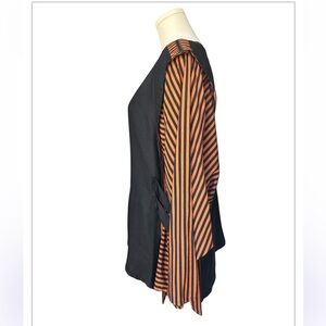 Step into bold vintage fashion with this striking Ann Marie women’s top. Featuring a dramatic asymmetrical silhouette, this unique top blends solid black fabric with vivid orange-and-black vertical stripes on the sleeves and trim. A zipper detail at the shoulder and tie detail at the side add a touch of deconstructed elegance. Shoulder pads that can easily be cut off. Perfect for lovers of avant-garde or New Romantic fashion, this piece makes a standout addition to any wardrobe.