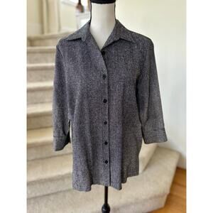 Excellent condition--note it is vintage sizing and different sizes for each item. Overall it is a size small. Black and white micro dot. Collared long sleeve button down shirt with back pleating. Pencil knee length skirt. Wide high rise bermuda style shorts, pleating at waist.