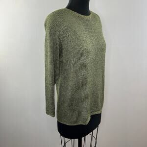 Ann McKenna Green Crochet Sweater Back Button Crew Neck Long Sleeve Pullover
