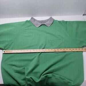 Ann Taylor Women's Collar Sweatshirt. Green oversized, baggy, faded green sweatshirt with gray collar, drop sleeves, chest pocket, and ribbed cuffs and hem. It is vintage 80s.