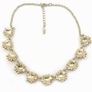 This necklace makes a really unique addition to any collection, especially for a collector of vintage Ann Taylor. Linked are ten rounded gold-tone flowers, each w/a spray of 3-D gold-tone metal stamens, each with a rhinestone. Sparkling without overwhelming, the stamens are evenly spaced in a hemisphere of flower, so flashes of light happen with the smallest movements. Hangs just below the collarbone.