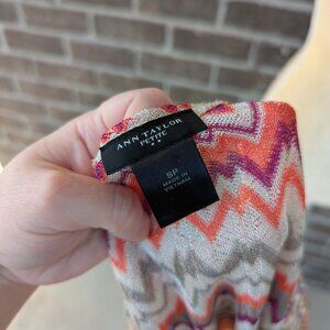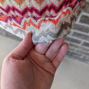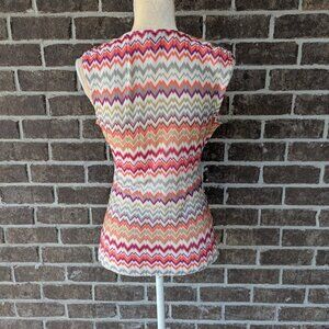 Vintage, chevron, sleeveless top with ruched sides. Fabric is semi sheer. There are some pulls in the fabric on the bottom hem, but otherwise this top is in good condition. Top is 100% polyester.