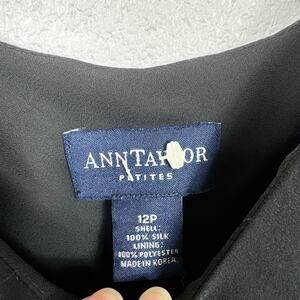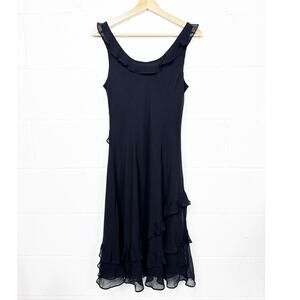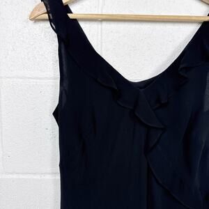 Vintage Ann Taylor 100% silk black midi dress with ruffle trim details, sleeveless cut, and flowy silhouette perfect for fairy grunge, whimsy goth, or vamp Y2K styling.