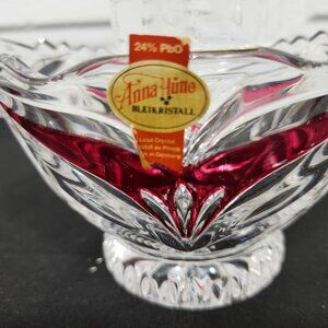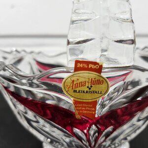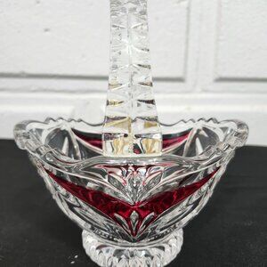 Beautiful vintage Anna Hutte Bleikristall 24% lead crystal Basket. Please understand this is a vintage, previously used item and there may be some light scratching in the red overlay. While the piece is in absolutely stunning condition please do not anticipate it to be in 100% mint condition. The basket is made of clear crystal with places of red overlay, measures roughly 7 inches tall and 6 inches across