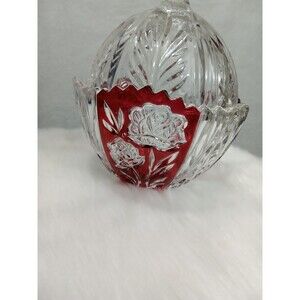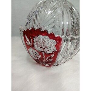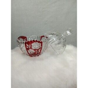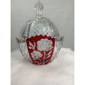 Vintage Anna Hutte Bleikristall Lead Crystal Red Rose Candy Dish w/ Lid Germany