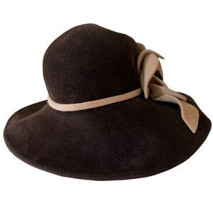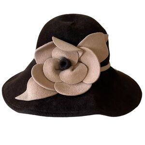 Vintage Anna Rixxo Firenze Fur Felt Floral Embellished Cloche Bucket Hat. Features a large tan flower on the front crown that has a stem that extends around the side, back, brim. Brim has wire edges that provide shape. Quality brown fur felt composition. 2nd to last photo is to provide an idea of how it looks on. Such a darling piece! In very good preloved condition with minimal normal wear. One size. Bundle to save big!