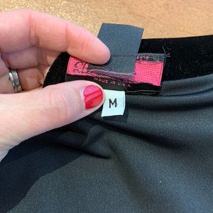 Vintage black velvet poet's shirt--live your best Morticia Addams life. Brand is "Anna-Bella" and the tag says "one size" on the front, but if you flip it over, it has a "M" tag. Shirt was bought for a size 6 woman. It's black stretch velvet with dramatic fluted sleeves, and a comfortable, not too short 24" length. Please note this shirt IS old--the front tie was elastic and has deteriorated, but doesn't affect the fit of the shirt. See listing photo. Could absolutely be cut off and replaced.