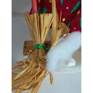 Open eyes, carrot nose, green hat, yellow mittens, two black pom poms, red dress with yellow stars and green trees, holds broom, snow covered base. Companion is Shoveling Snowflakes 752599. Snow women are very rare and hard to find since the men were produced 95% of the time