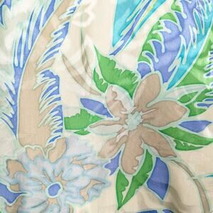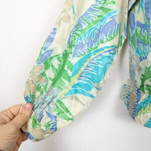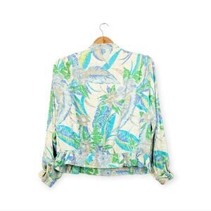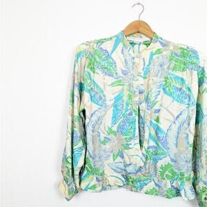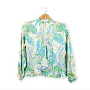 Vintage Anne Crimmins UMI Collection 100% Silk Button Down Blouse. A vintage tropical floral print with subtle colors. Featuring a slight V-Neck, button down, flared bottom hem and button cuffs.