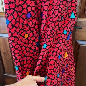 This is a totally 1980’s dress!!! Bright red with green, blue, black, orange- bright vibrant colors. The front buttons with triangle buttons.