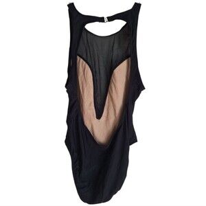 Stylish black one-piece swimsuit with mesh detailing. Perfect for a sleek beach look.