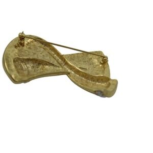 This elegantly designed Anne Klein vintage brooch showcases a captivating twist shape adorned with clear rhinestones. Its gold-tone finish adds a sophisticated touch, making it suitable for formal occasions or as a statement accessory. Crafted with attention to detail, this brooch is a timeless piece that enhances any ensemble.