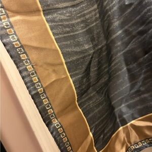 Elegant gray and gold scarf with a unique pattern. Perfect for adding a touch of sophistication to any outfit. Measures 21”X21”. Unknown material. EUC!