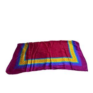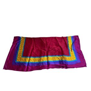 This vintage Anne Klein silk scarf showcases a vibrant geometric border in red, purple, blue, and yellow tones. Lightweight and versatile, it complements various outfits seamlessly.