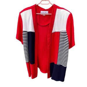 Vintage Another Thyme size L red white blue knit cardigan that is striped and color block pattern. Short sleeves. This is a bunny knit. No size or fabric tag but I’m guessing a polyester nylon blend. Open front. Pit to pit 29” and length 32”. This has shoulder pads.