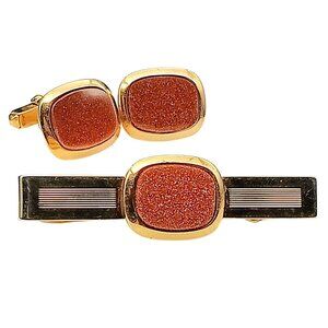 Vintage Anson Gold & Copper Goldstone Cufflinks Tie Clip Set Midcentury Formal A