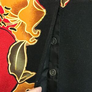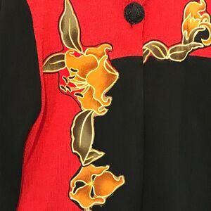 Stylish black and red jacket with floral design. Features a button closure. Perfect for adding a bold touch to your outfit.
