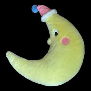 * Charming vintage anthropomorphic crescent moon plush from the 1980s or 1990s, measuring approximately 18" long by 16" wide. Features a soft yellow plush body with human-like facial features, including plastic eyes and a pink felt cheek, topped with a whimsical pink nightcap and blue pom-pom. A nostalgic piece that appeals to both collectors of character plush and those looking to add a vintage touch to nursery or children’s room decor.